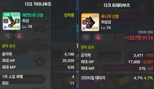 오른쪽 신발은 공격력은 조금 낮지만, 크리티컬 데미지 옵션이 붙어있어 훨씬 강력합니다! 왼쪽 신발의 공격력, 스킬 레벨, 회피 옵션은 크리티컬 데미지의 효율을 따라갈 수 없어요.