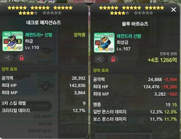 왼쪽 신발은 [크리티컬 데미지] 옵션이 핵심입니다. 오른쪽 신발의 일반 몬스터 데미지와 보스 몬스터 데미지 옵션을 합쳐도 크리티컬 데미지의 잠재력을 따라올 수 없습니다!