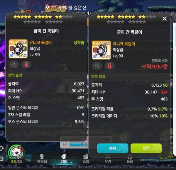 👉 아이템 : '금이 간 목걸이' 비교 결과, 오른쪽을 추천합니다! 🔍 아이템 상세 비교 왼쪽 : 총 공격력 6,600, 데미지 17.7% 🔥 오른쪽 : 총 공격력 6,110, 크리티컬 데미지 9.6%, 보스 몬스터 데미지 9.1% 💡 분석 코멘트 오른쪽 아이템은 총 공격력은 약간 낮지만, 크리티컬 데미지 옵션이 있어서 훨씬 강력합니다. 딜 상승에 큰 …