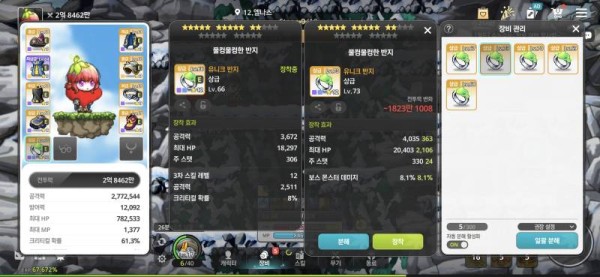 오른쪽 반지는 공격력이 다소 낮지만, 보스 몬스터 데미지 옵션 덕분에 효율이 훨씬 좋습니다! 왼쪽 반지의 3차 스킬 레벨 옵션은 아쉽지만 큰 도움이 되진 않을 거예요.