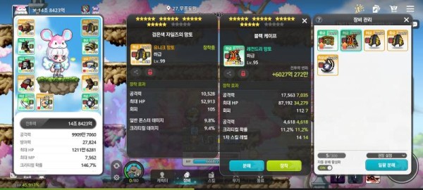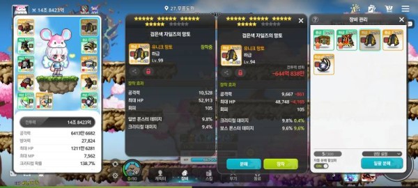 왼쪽 : 총 공격력 10,528, 일반 몬스터 데미지 9.8%, 크리티컬 데미지 9.4%