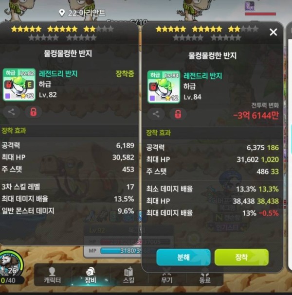 오른쪽 반지가 총 공격력도 더 높고, 최소 데미지 배율까지 붙어있어서 훨씬 강력합니다. 왼쪽 반지의 일반 몬스터 데미지나 3차 스킬 레벨은 크게 의미 없으니 미련 버리세요!