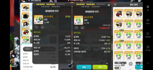 오른쪽 반지는 총 공격력이 더 높을 뿐만 아니라, 중요한 크리티컬 데미지 옵션까지 붙어있어 데미지 상승에 훨씬 유리합니다. 왼쪽의 데미지 % 옵션은 아쉽지만, 크리티컬 데미지의 잠재력을 따라가기엔 부족합니다.