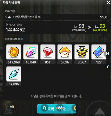 - 오호, 분당 마릿수가 95.8마리! 시간당 경험치 효율은 0.91% 준수하네요! 👍 이정도면 맘 편히 주무셔도 될 정도입니다.