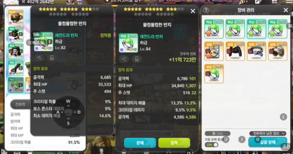 🔍 왼쪽 : 보스 몬스터 데미지 9%, 크리티컬 확률 9%, 최소 데미지 배율 14.6%