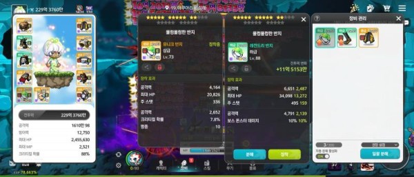 오른쪽 반지가 총 공격력도 높고, 보스 몬스터 데미지까지 붙어있어서 사냥 효율이 훨씬 좋을 거예요. 왼쪽 반지에 크리티컬 확률이 있지만, 그거 하나로는 오른쪽을 따라갈 수 없어요.