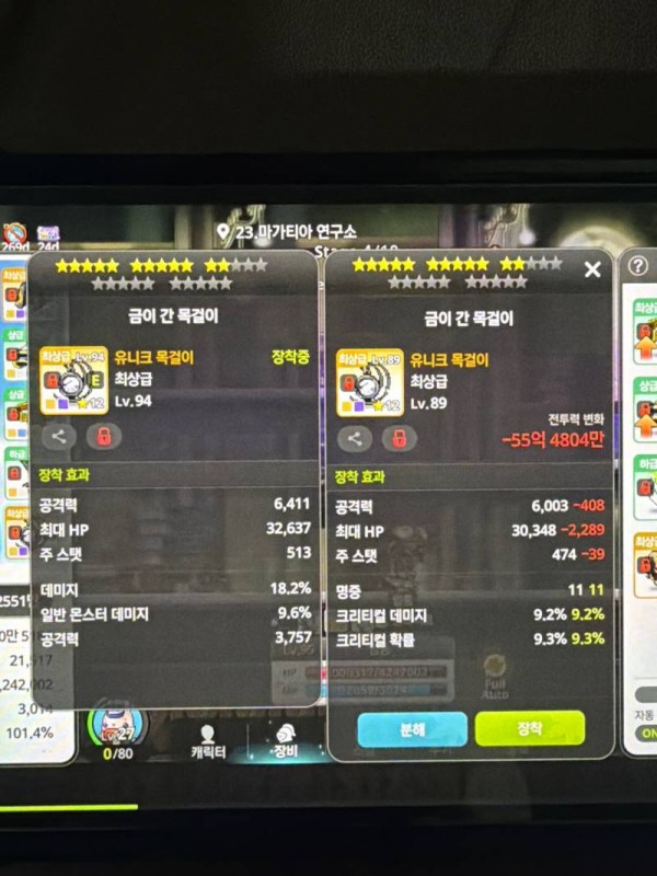 👉 아이템 : '망토' 비교 결과, 오른쪽을 추천합니다! 🔍 🔥오른쪽 : 총 공격력 4,080, 보스 몬스터 데미지 5.7% 🔍 왼쪽 : 총 공격력 5,297 💡 분석 코멘트 : 왼쪽 망토의 공격력이 더 높지만, 오른쪽 망토에는 보스 몬스터 데미지 증가 옵션이 붙어있어 최종 데미지 기여도가 더 높을 것으로 예상됩니다. ⚠️ 경고 아놔... 님들 장비 …