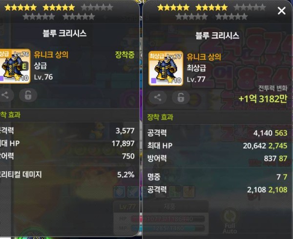 🔍 왼쪽 : 총 공격력 3,577, 크리티컬 데미지 5.2%