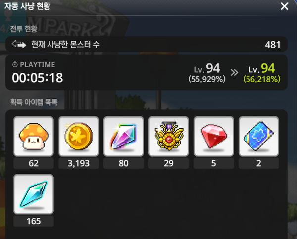 - 획득 경험치: 0.289% (56.218% - 55.929%)