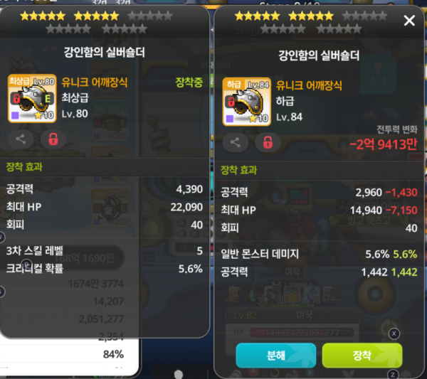 왼쪽 : 총 공격력 4,390, 크리티컬 확률 5.6%, 3차 스킬 레벨 +5