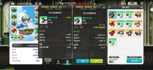 🔍 왼쪽 : 총 공격력 7,383, 크리티컬 확률 6.8%