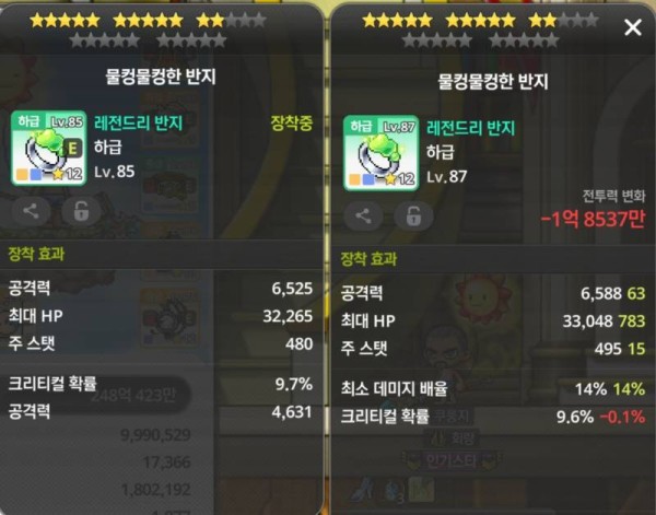 👉 아이템 : '검은색 가람 치마' 비교 결과, 오른쪽을 추천합니다! 🔍 아이템 상세 비교 왼쪽 : 총 공격력 17,271, 일반 몬스터 데미지 9.7% 🔥 오른쪽 : 총 공격력 12,802, 크리티컬 데미지 9.1% 💡 분석 코멘트 오른쪽 아이템은 총 공격력은 낮지만 크리티컬 데미지가 붙어있어 효율이 좋습니다. ⚠️ 경고 아... 열심히 계산했는데.…
