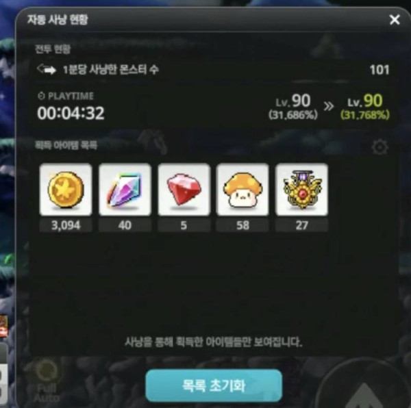 - 획득 경험치: 0.082% (31.768% - 31.686%)