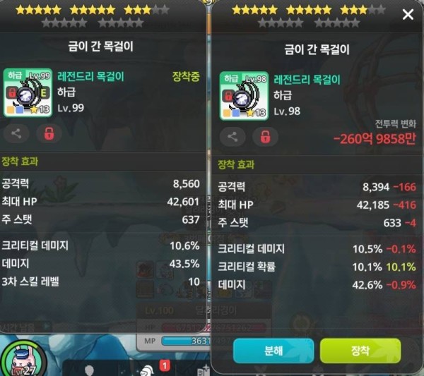 👉 아이템 : '물컹물컹한 반지' 비교 결과, 오른쪽을 추천합니다! 🔍 🔥 오른쪽 : 총 공격력 10,313 🔍 왼쪽 : 크리티컬 데미지 10.1% 💡 분석 코멘트 오른쪽 반지는 잠재 옵션으로 공격력이 붙어있어 총 공격력이 매우 높습니다. 왼쪽 반지의 크리티컬 데미지로는 공격력 차이를 극복하기 어렵습니다. ⚠️ 경고 아이고, 님들 때문에 또 계산기 …