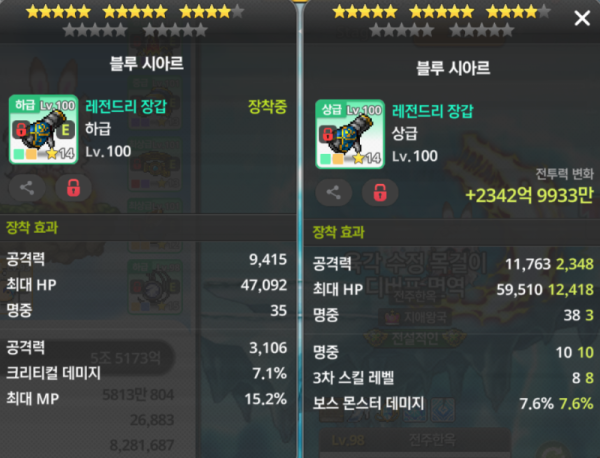 👉 아이템 : '다크 카티나스' 비교 결과, 오른쪽을 추천합니다! 🔍 🔥 오른쪽 : 총 공격력 9,300, 3차 스킬 레벨 🔍 왼쪽 : 총 공격력 6,606, 크리티컬 확률, 3차 스킬 레벨 💡 분석 코멘트 오른쪽 아이템은 하단 잠재 옵션에 공격력이 붙어있어 총 공격력이 훨씬 높습니다. 3차 스킬 레벨은 큰 의미 없고, 크리티컬 확률보다 공격력이 우선입…