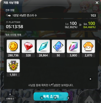 - 획득 경험치: 2.164% (64.466% - 62.302%)