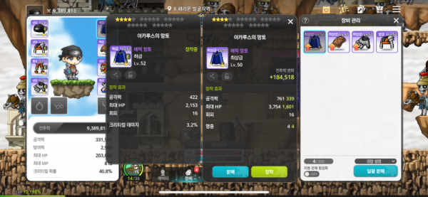 오른쪽 망토는 기본 공격력이 월등히 높고, 명중 옵션도 붙어있어 사냥에 더 유리할 겁니다! 왼쪽의 크리티컬 데미지도 좋지만, 초반에는 공격력이 깡패인 거 아시죠?