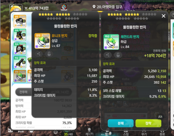 오른쪽 반지가 총 공격력도 높고, 크리티컬 데미지도 더 붙어있으니 무조건 이득입니다. 3차 스킬 레벨은 덤이구요.