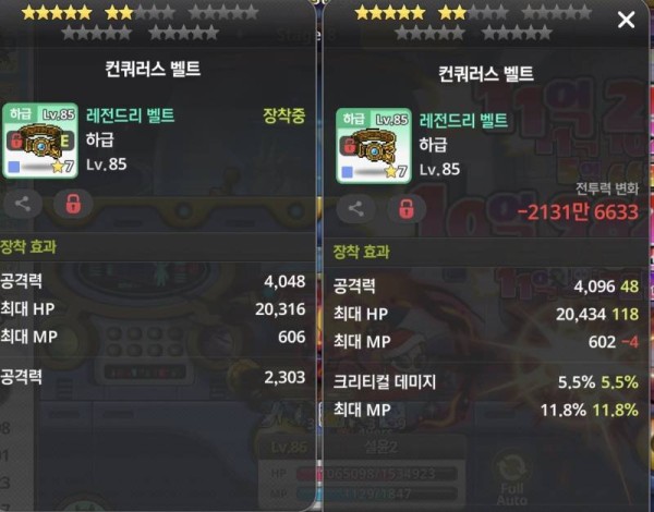 왼쪽 벨트의 총 공격력이 훨씬 높지만, 오른쪽 벨트에 붙은 크리티컬 데미지 옵션이 공격력 차이를 압도합니다. 무조건 오른쪽입니다!