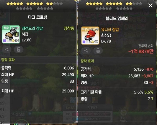 총 공격력 차이가 870이나 나네요. 크리티컬 확률이 아쉽긴 하지만, 공격력 차이가 워낙 커서 왼쪽이 훨씬 좋습니다.
