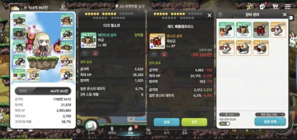 왼쪽 : 총 공격력 5,620, 일반 몬스터 데미지 6.7%, 3차 스킬 레벨 +6