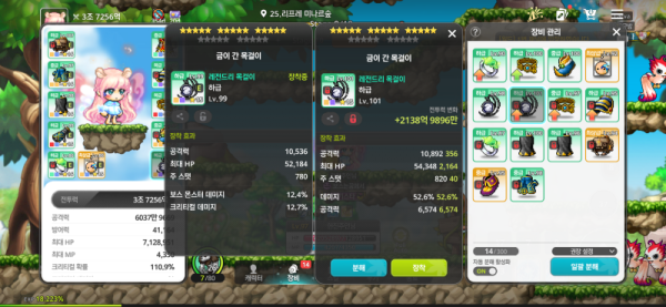 왼쪽 : 총 공격력 10,536, 보스 몬스터 데미지 12.4%, 크리티컬 데미지 12.7%