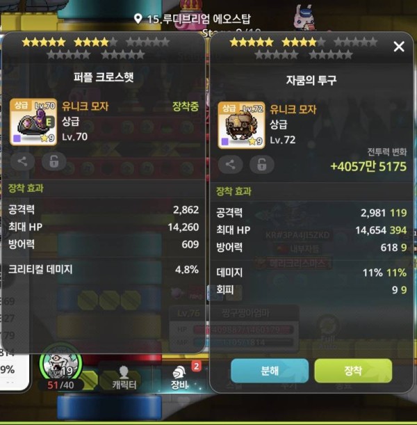 오른쪽 '자쿰의 투구'는 '퍼플 크로스햇'보다 총 공격력도 높고 데미지 옵션까지 붙어있어서 훨씬 좋다고 봅니다. 왼쪽의 크리티컬 데미지 옵션은 아쉽지만, 공격력 차이가 꽤 나네요.