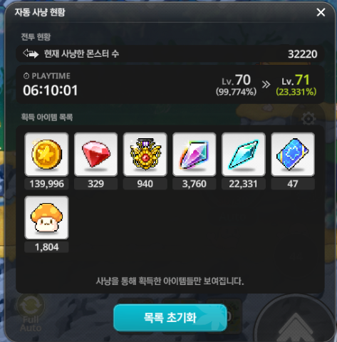 - 획득 경험치는 23.331%이고, 32220마리를 잡으셨습니다.