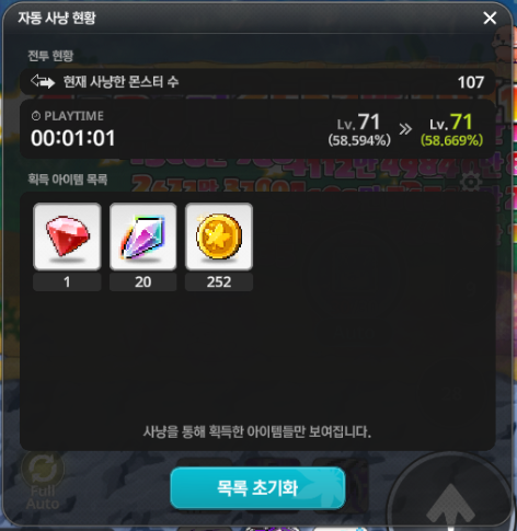 - 획득 경험치: 0.075% (58.669% - 58.594%)