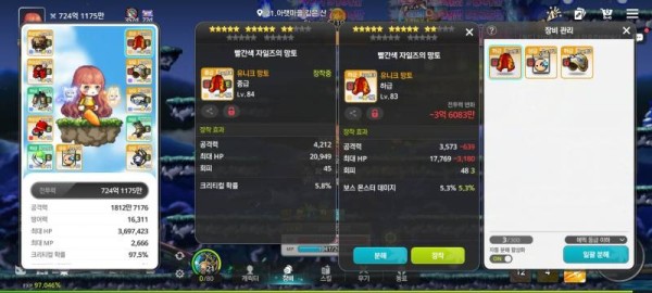 왼쪽 망토는 크리티컬 확률이 붙어있고 오른쪽 망토는 보스 몬스터 데미지가 붙어있습니다. 크리티컬 확률이 보스 몬스터 데미지보다 효율이 좋습니다.