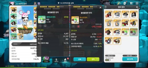 오른쪽 반지가 총 공격력은 좀 낮아도, 핵심 옵션인 크리티컬 데미지를 가지고 있어서 효율이 훨씬 좋습니다! 보스 몬스터 데미지도 챙길 수 있으니 금상첨화죠. 왼쪽의 최소 데미지 배율은 아쉽지만 다음 기회를 노려보세요!