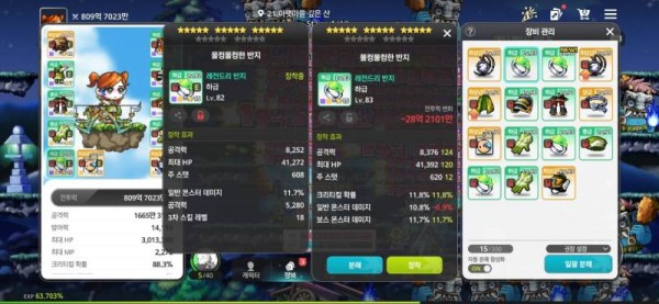 🔍 🔥 오른쪽 : 총 공격력 8,376, 크리티컬 확률 11.8%, 일반 몬스터 데미지 10.8%, 보스 몬스터 데미지 11.7%