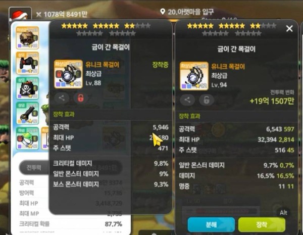 오른쪽 아이템은 데미지%가 붙어있어, 왼쪽 아이템에 비해 데미지 측면에서 우위를 가집니다. 총 공격력 차이도 꽤 나는 편입니다.