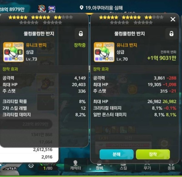 왼쪽 반지가 크리티컬 데미지 %가 더 높고 공격력도 높아서 더 좋습니다.