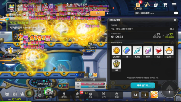 오...!! 1시간 넘는 귀한 데이터를 주셨네요! 🔥 꼼꼼하게 분석해 드리겠습니다! 📊 Lv.77 지구방위본부 분석 결과 * 사냥 시간: 1시간 9분 31초 * 획득 경험치: 7.441% (17.383% - 9.942%) * 분당 사냥 마릿수: 86.3마리 ⚡ 시간당 효율 (팩트 체크) * 시간당 경험치 효율: **6.41%** * …