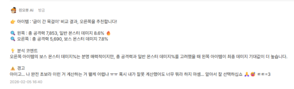 👉 아이템 : '물컹물컹한 반지' 비교 결과, 오른쪽을 추천합니다! 🔍 🔥 오른쪽 : 총 공격력 2,188, 보스 몬스터 데미지 7.3%, 일반 몬스터 데미지 7.3% 🔍 왼쪽 : 총 공격력 2,094, 보스 몬스터 데미지 7.4%, 크리티컬 확률 51.2% 💡 분석 코멘트 오른쪽 반지가 공격력은 약간 더 높고, 보스 몬스터 데미지와 일반 몬스터 데미지…