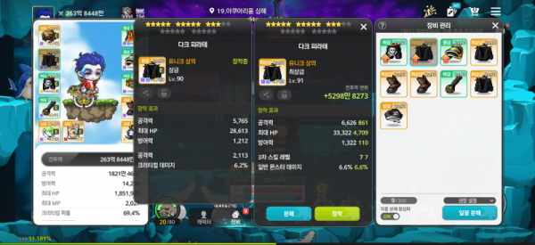 오른쪽 아이템이 총 공격력은 조금 낮지만, 일반 몬스터 데미지 옵션이 붙어있어 사냥에 더 유리할 겁니다!