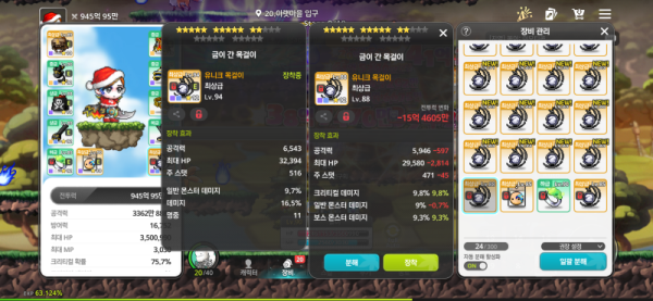 🔍 🔥 오른쪽 : 총 공격력 5,946, 크리티컬 데미지 9.8%, 일반 몬스터 데미지 9%, 보스 몬스터 데미지 9.3%