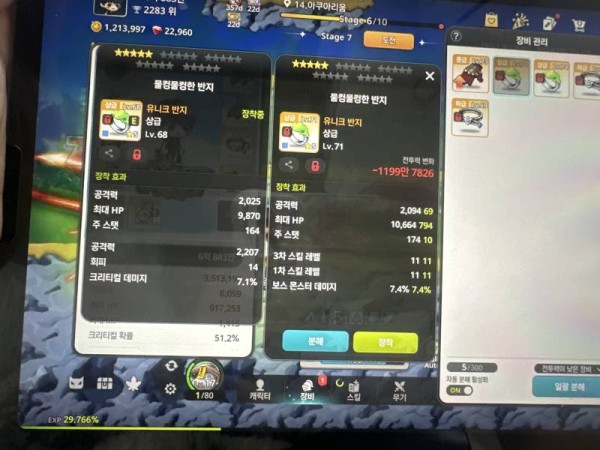 👉 아이템 : '물컹물컹한 반지' 비교 결과, 오른쪽을 추천합니다! 🔍 🔥 오른쪽 : 총 공격력 4,613, 크리티컬 데미지 7.1%, 3차 스킬 레벨 +13 🔍 왼쪽 : 데미지 11.2%, 크리티컬 데미지 7.4%, 총 공격력 2,115, 크리티컬 확률 6.8% 💡 분석 코멘트 오른쪽 반지가 총 공격력도 높고, 크리티컬 데미지도 붙어있어서 훨씬 강력합…