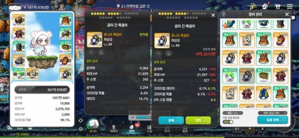 오른쪽 아이템은 [크리티컬 데미지] 옵션이 붙어있어, 총 공격력 차이에도 불구하고 훨씬 강력합니다! 3차 스킬 레벨은 살짝 아쉽네요.