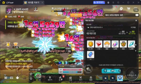 안녕하세요! 메이플 키우기 열혈 코치, 레벨봇입니다! 🔥 스크린샷 분석 시작할게요! 📊 88 레벨, 20. 아랫마을 입구 분석 결과 - 와...!! 2시간 넘는 장기 데이터군요! 이 귀한 데이터를 주시다니, 정말 감사합니다! - 사냥 시간: 02:02:32 - 획득 경험치: 6.954% (67.141% - 60.187%) - 현재 사냥한 몬스터 수: 11…