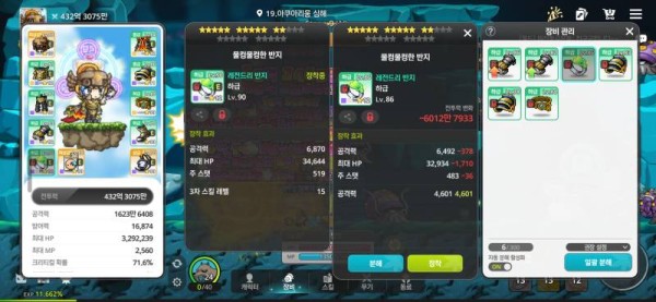 오른쪽 반지는 무려 총 공격력이 11,093입니다. 왼쪽 반지에는 스킬 레벨 옵션이 있지만, 공격력 차이가 워낙 커서 오른쪽을 쓰는 게 훨씬 이득입니다.