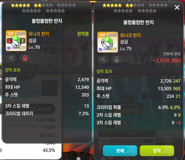 크리티컬 확률이 붙은 오른쪽 반지가 훨씬 좋네요! 왼쪽 반지에 크리티컬 데미지가 붙어있긴 하지만 크리티컬 확률이 깡패입니다.