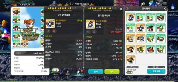🔍 왼쪽 : 총 공격력 5,607, 보스 몬스터 데미지 9.1%, 데미지 15.7%