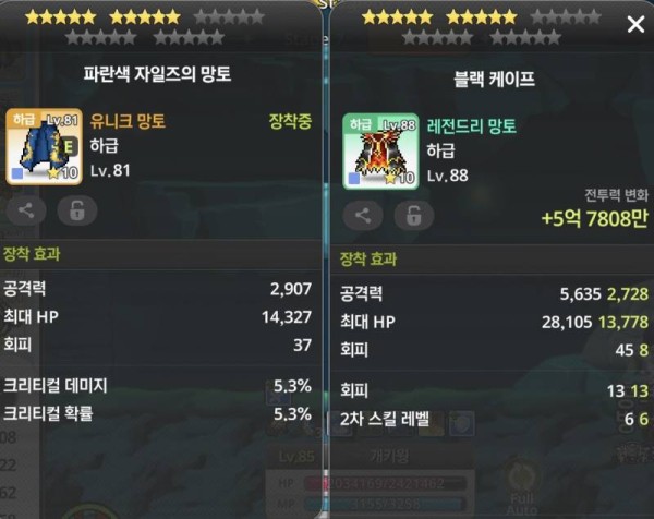 왼쪽 : 총 공격력 2907, 크리티컬 데미지 5.3%, 크리티컬 확률 5.3%