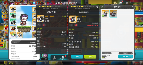 🔍 🔥 오른쪽 : 총 공격력 3,056, 보스 몬스터 데미지 7.7%, 크리티컬 데미지 7.7%