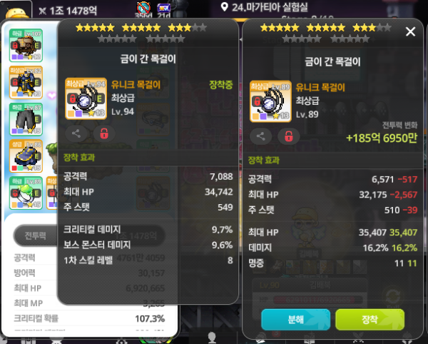 오른쪽 아이템은 데미지%가 붙어있어, 공격력 차이에도 불구하고 왼쪽보다 좋습니다.