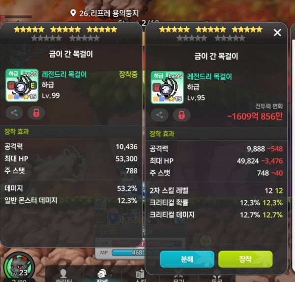 오른쪽은 공격력이 조금 낮지만, 크리티컬 데미지 옵션이 있어서 훨씬 강력합니다! 왼쪽의 데미지 증가 옵션으로는 오른쪽의 폭발적인 딜을 따라갈 수 없어요.