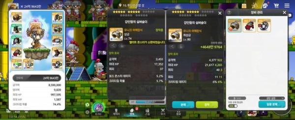🔍 왼쪽 : 총 공격력 3,455, 보스 몬스터 데미지 5.2%, 크리티컬 확률 5.7%