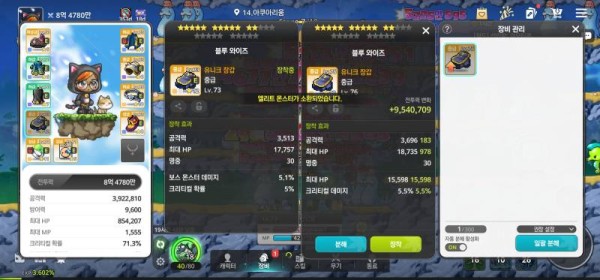 🔍 왼쪽 : 총 공격력 3,513, 보스 몬스터 데미지 5.1%, 크리티컬 확률 5%